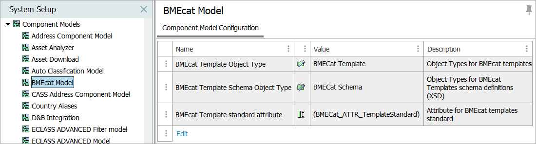 Note: Although the BMEcat Template Schema Object Type displays in the component model, it is not configurable. Users should continue to contact their Professional Services or Stibo Systems representative for BMEcat Schema validation solution needs.