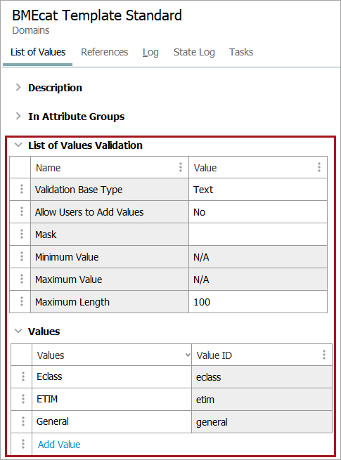 Click BMEcat Template Standard to display the List Of Values (LOV) information, which comes pre-configured with the needed information for the List of Values Validation and Values sections. This LOV contains the template standard types (ECLASS, ETIM, and General) that will be associated with the BMEcat Template Object Type assets created. If other template standard types are needed for selection outside of those offered, they can be added by clicking Add Value under the Values section.