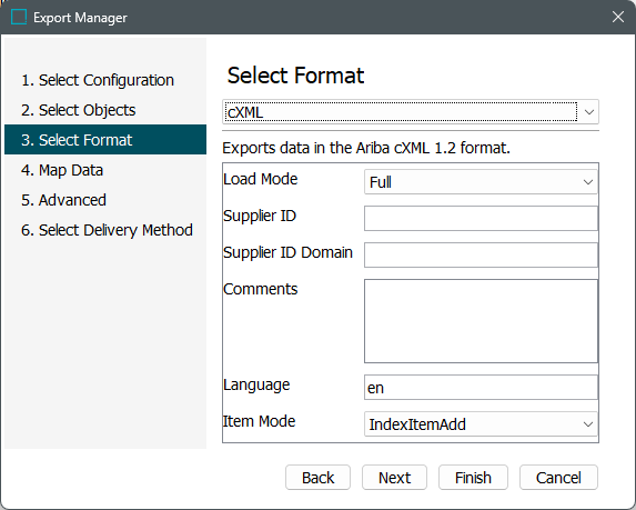 The cXML format exports data using Ariba cXML 1.2 and is an XML-based language designed specifically for communication of e-commerce business documents. For more information, search the web.