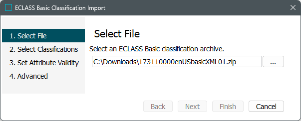 The ECLASS classification data is delivered in a .ZIP file, where the file name indicates the version. The import wizard uses a background process to create attributes (if necessary), and classification folders that include the version number. This allows you to access multiple versions of ECLASS within the same system.