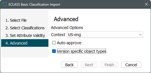 To create a version-specific object type structure, select 'Version specific object types' on the Advanced step of the ECLASS Classification Importer.