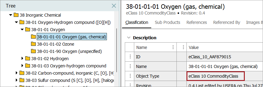 In STEP, ECLASS classifications are linked to objects (materials, products, and/or services) via a 'product-to-classification link type' reference type. This displays objects within the ECLASS folder as shown in the image below.