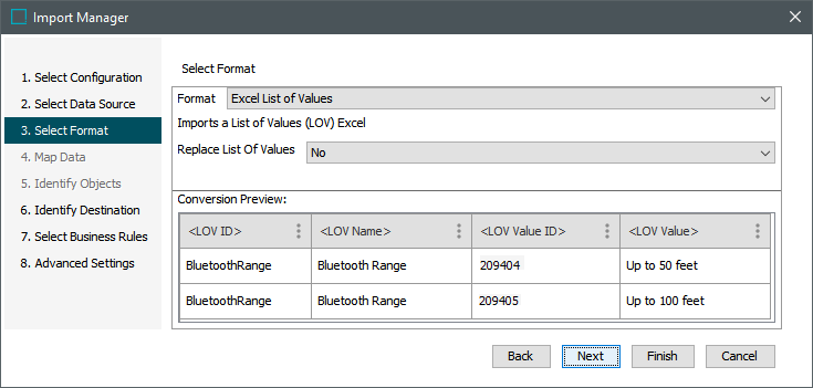 On the 'Select Format' step, the 'Excel List of Values' format is automatically selected if the file has the required columns.