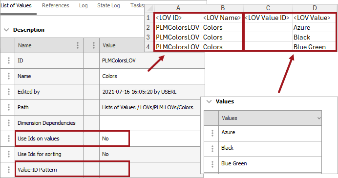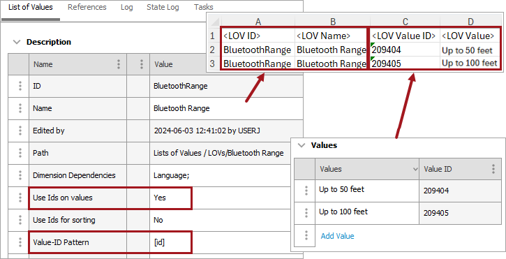 Note: An <LOV Value ID> must be unique within the applicable <LOV ID>. It is recommended to set the 'Use Ids on values' parameter to 'Yes' and to set the 'Value-ID Pattern' parameter to '[id]' (as shown in the image below) to ensure unique <LOV Value ID> entries.