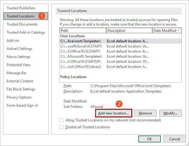 Additionally, click the box to enable 'Subfolders of this location are also trusted.'