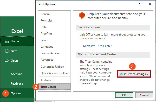 Click on Options > Trust Center > and click on Trust Center Settings.