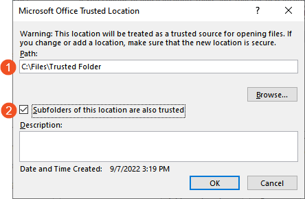 Enter the path for the folder you created that will receive 'trusted location' status. The 'Trusted Folder' location path was entered.