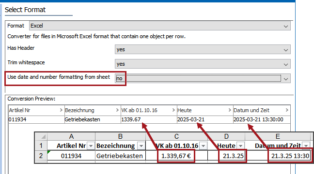 By default, the Use date and number formatting from sheet parameter is set to 'no.' The 'no' setting allows for numeric values to be automatically imported in a standardized, US-English based format, and for date values to be automatically imported in ISO format, instead of the regional formats that may appear in source spreadsheets.