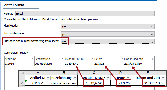 As an example of the 'no' setting, the below screenshot shows the Conversion Preview for a spreadsheet created on a computer with its region set to Germany, displaying currency in a Euro format and dates in a German format. When no is selected for 'Use date and number formatting from sheet,' the currency and dates are automatically transformed into the following standard formats: date values as yyyy-MM-dd, date-time values as yyyy-MM-dd HH:mm:ss, and numeric values as #.##########.
