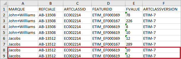 - REFCIALE (text), based on your data model, can be the product STEP ID, or an attribute on the product that holds the ID. The REFCIALE is repeated in the output as many times as there are different ETIM features.
