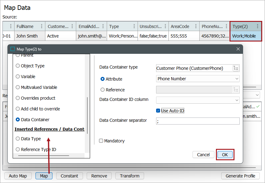In the next three columns, make mappings related to the Customer Phone Numbers using a different Data Container type. When switching types, the separator resets to the default.