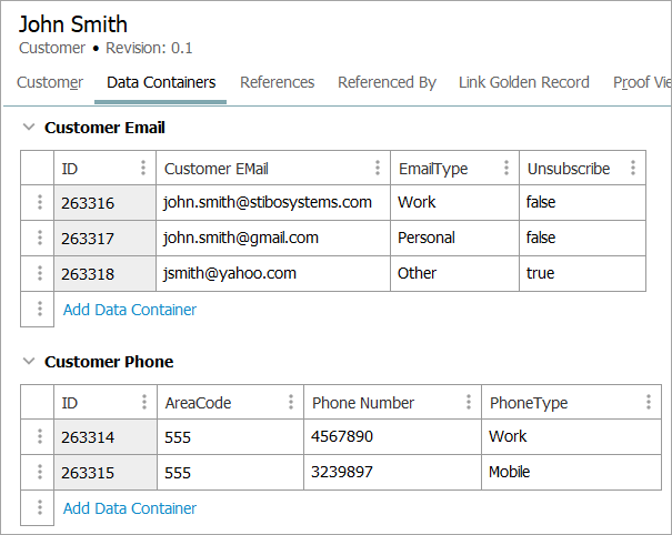 When the import completes successfully, the new Customer is created with data containers populated as defined in the JSON document:
