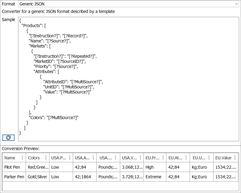 . The Conversion Preview area displays the results of the input document against the provided template.