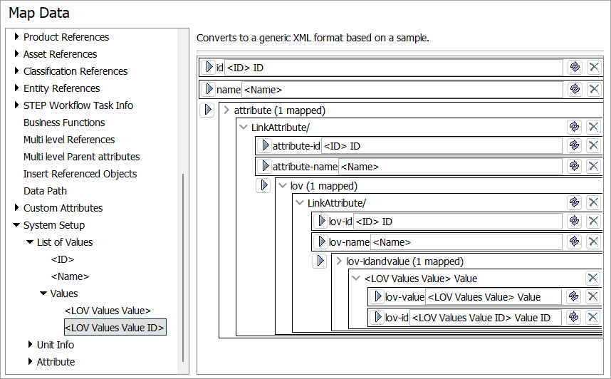 For details on mapping, refer to Mapping Attribute Links, LOVs, and LOV Values in Generic XML.