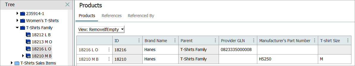 The objects selected for export includes two products, one without either of the optional values (Manufacturer's part Number and T-shirt Size) and the other with only one of the optional attributes.