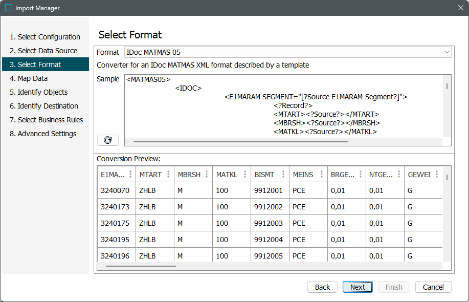 The IDoc MATMAS 05 format is XML-based and is used when exchanging information with SAP. For more information, search the web.