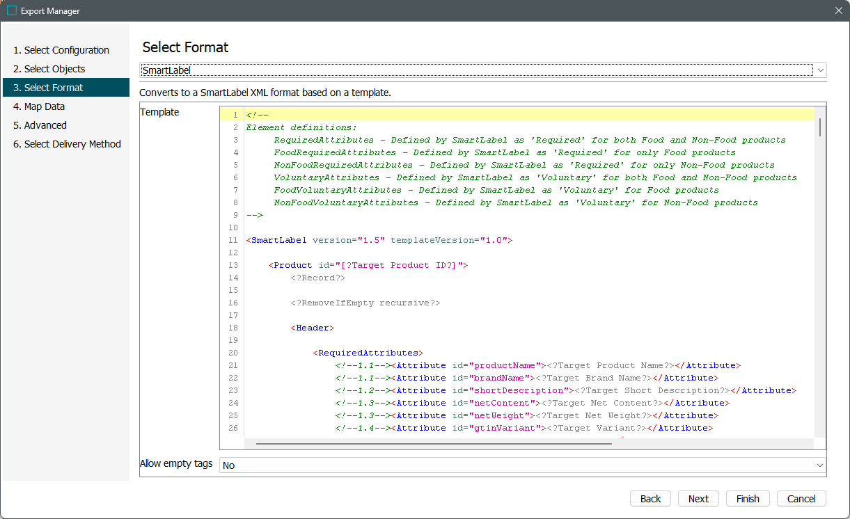 - Template - displays the standard template for export each time a new export is created. The default template includes both food and non-food attributes, and should be modified to exclude attributes not required in your export. The modified template is saved with the export configuration or OIEP output template. For details on modifying the template to suit your data, refer to the Configuring the SmartLabel Template topic.