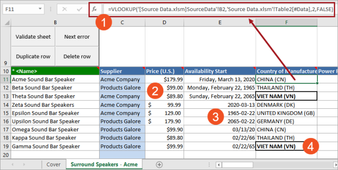 • Cells that contain formulas are always validated, since their values can change along with the source data. Changing a value in an external cell in source data is treated as a change in the sheet.