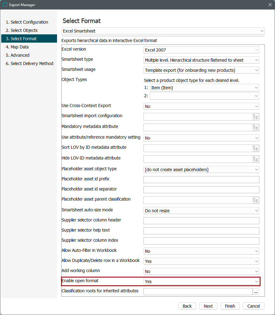To export an open format Smartsheet, choose 'Yes' for the Enable open format parameter on the 'Select Format' screen of the Export Manager wizard. The default value is No. For full details on how to configure Smartsheet export configurations, refer to the Smartsheet Data and Template Configurations topic.
