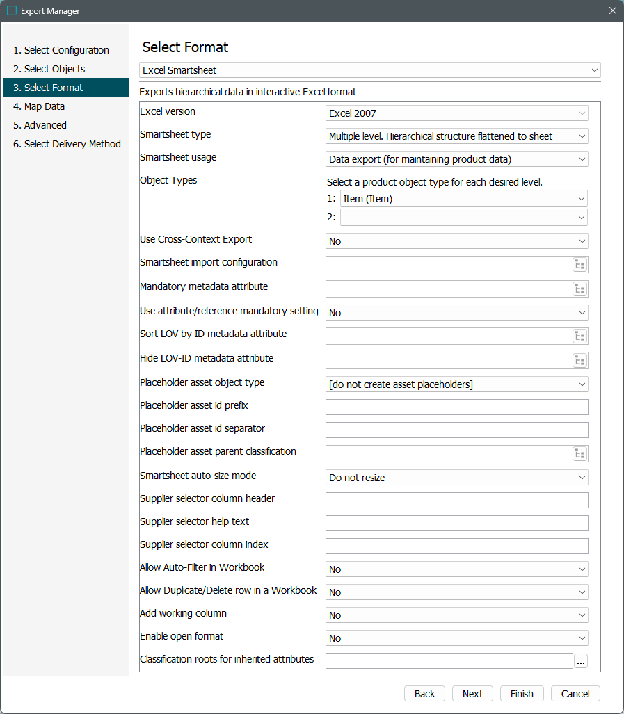 - For multi-level Smartsheets, specify the object type of the products for each level in the multi-level export. The object type must be valid for each level. The top level must be allowed under the root product selected in the Select Object step of the wizard. A maximum of five (5) entries are allowed.