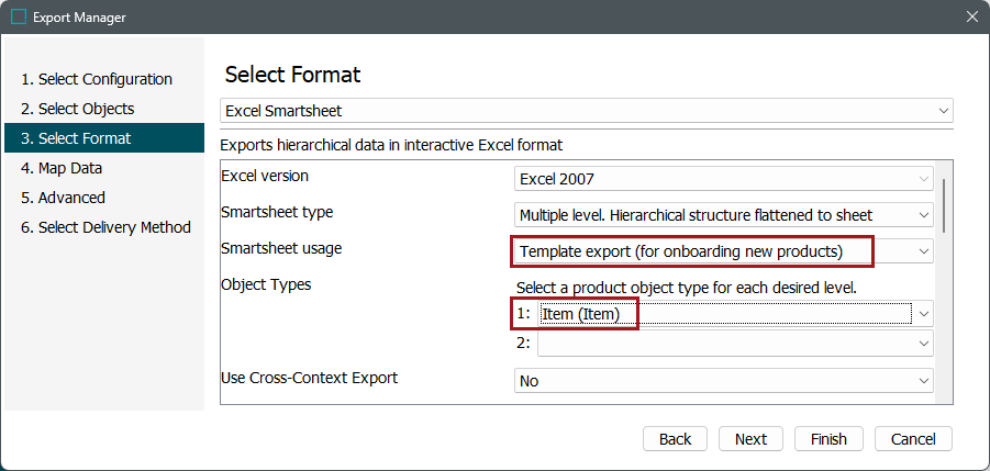 - In this example, the Smartsheet Export Configuration is set to 'Template export' using the object type of 'Item.'