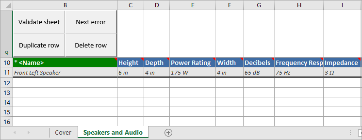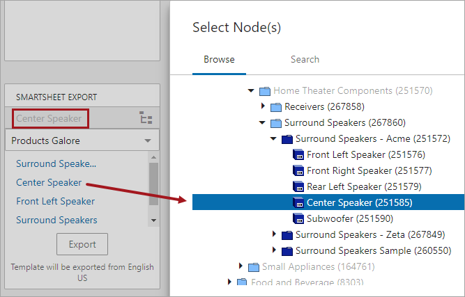 - In the Web UI, this Smartsheet template is exported from the Smartsheet Export Widget using the 'Center Speaker' object. 'Center Speaker' is the same object type (Item) as the referenced example product ('Front Left Speaker').