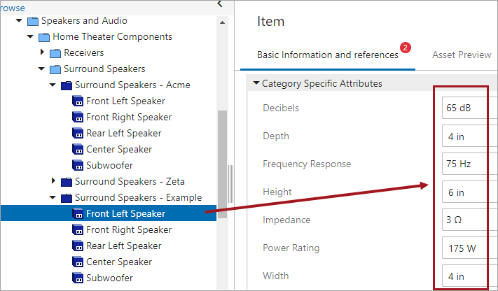 - The example product is an Item object named 'Front Left Speaker.' It contains values for category-specific attributes such as Decibels, Frequency Response, Height, Width, and so forth.