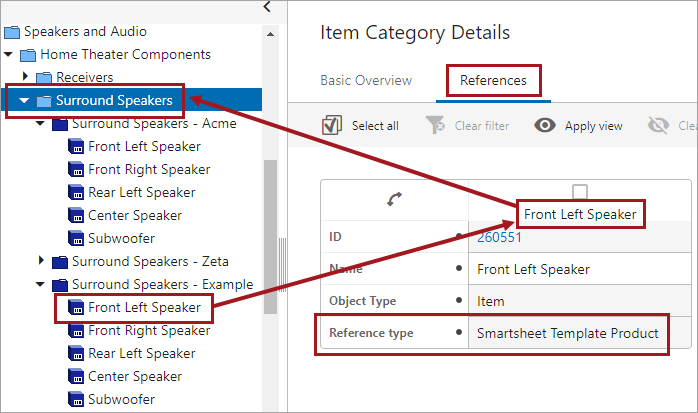 - The 'Front Left Speaker' example product is referenced by the top-level of the product category ('Surround Speakers') using the Smartsheet Template Product reference.