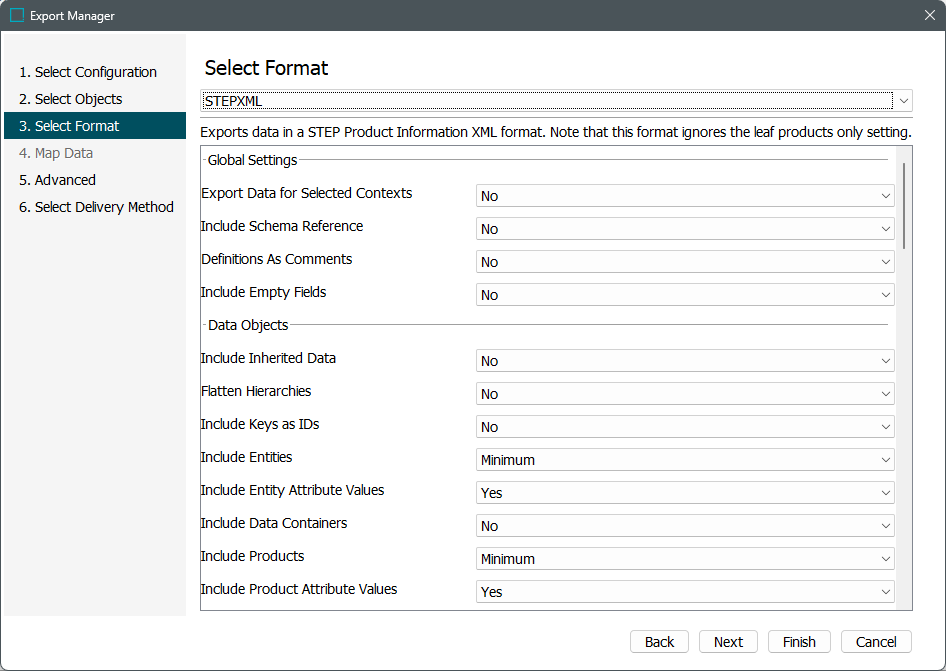 Select No or Yes to include empty fields in the export. This is set to 'No' by default. If 'Yes' is selected, and attribute values and/or data containers and/or references or links (including metadata) are included in the STEPXML configuration, then the export will include all valid and linked data, whether the exported object has a value, data container(s) or a target. To include all calculated attributes that are valid for the objects in the scope of the export even when they resolve to an empty value, you must also enable the 'Include Calculated Attribute Values' checkbox on the Advanced step of Export Manager or OIEP tab. Note: STEPXML is intended for use with external systems for integration purposes. Exported empty values are not intended to be imported into STEP. |