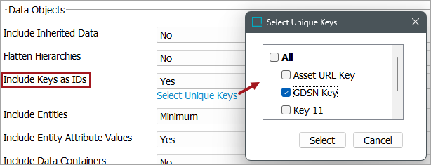 For more on keys, refer to the Unique Keys topic in the System Setup documentation. For an Advanced STEPXML template, this option is included in the IncludeKey Tag. For more information, refer to the IncludeKey Tag in STEPXML topic in the Data Exchange documentation. |