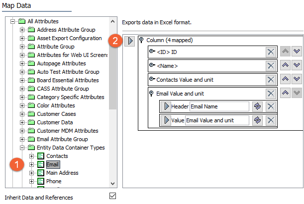For exporting entity data containers into CSV or Excel formats (which require mapping), only All Attributes can be used. Using this option, data containers can be mapped directly to the export or included in a higher level selection.