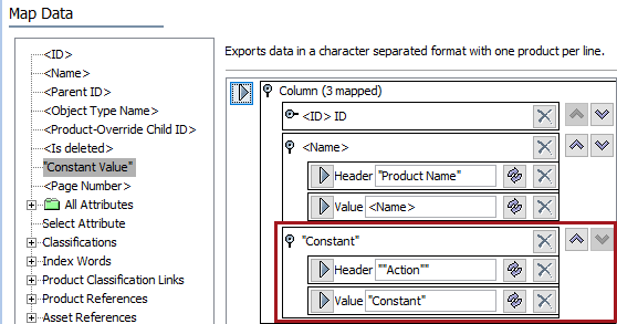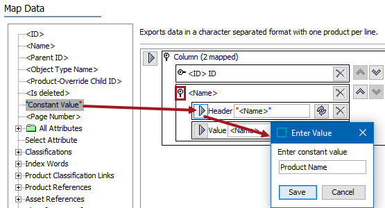 Mapping a constant value allows you to replace the default data with your own text. For example, use a constant value to change a header from the default of <Name> to 'Product Name', or to add static text to the value.