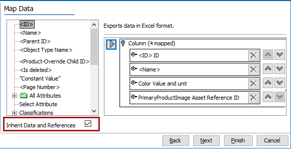 The 'Inherit Data and References' option shown below is the default setting and is global, in that it applies to all attribute values or references selected in the Map Data window. When checked, the output includes values that are inherited from objects at a higher level in the hierarchy.