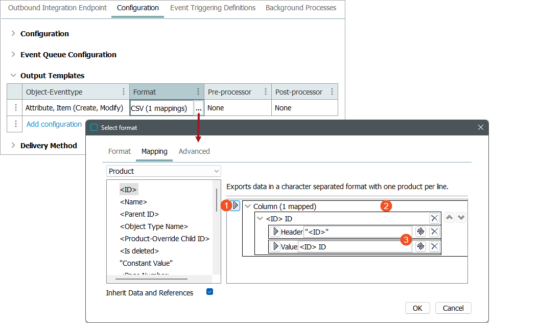 The user interface for the mapping step of the Export Manager tool and the outbound integration endpoint tool are not exactly the same. For Export Manager, mapping is described in the Export Manager - Map Data topic. For OIEPs, mapping is handled in the Output Templates section under the Format parameter as described in the OIEP - Event-Based - Output Templates Section topic or the OIEP - Select Objects - Output Templates Section topic.