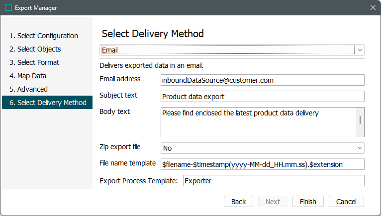 Similar to the 'Copy to directory' delivery method, the email delivery option allows the delivery to be zipped. This method is typically used to test the export output, or to deliver a small export to one or more persons.