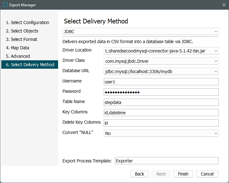 The JDBC delivery method allows STEP data to be delivered directly to tables in Relational database management systems (RDBMS) like Oracle, MySQL, MS SQL Server, and PostgreSQL. Though the ways the JDBC plugin can be deployed are various, one of its prime uses is to send STEP data to data analytics tools for the purpose of displaying STEP data in a data analytics dashboard. This delivery method requires CSV format and is available in both the Export Manager and in outbound integration endpoints (OIEPs).