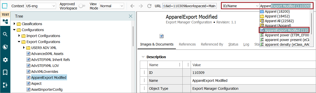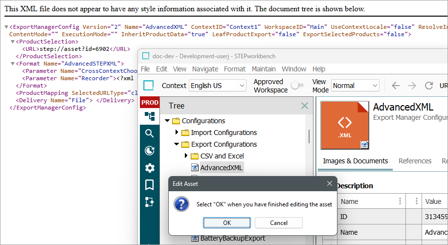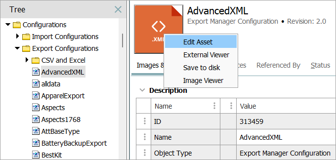 - Select an export configuration, right-click the XML thumbnail displayed on the Images & Documents tab and click Edit Asset.