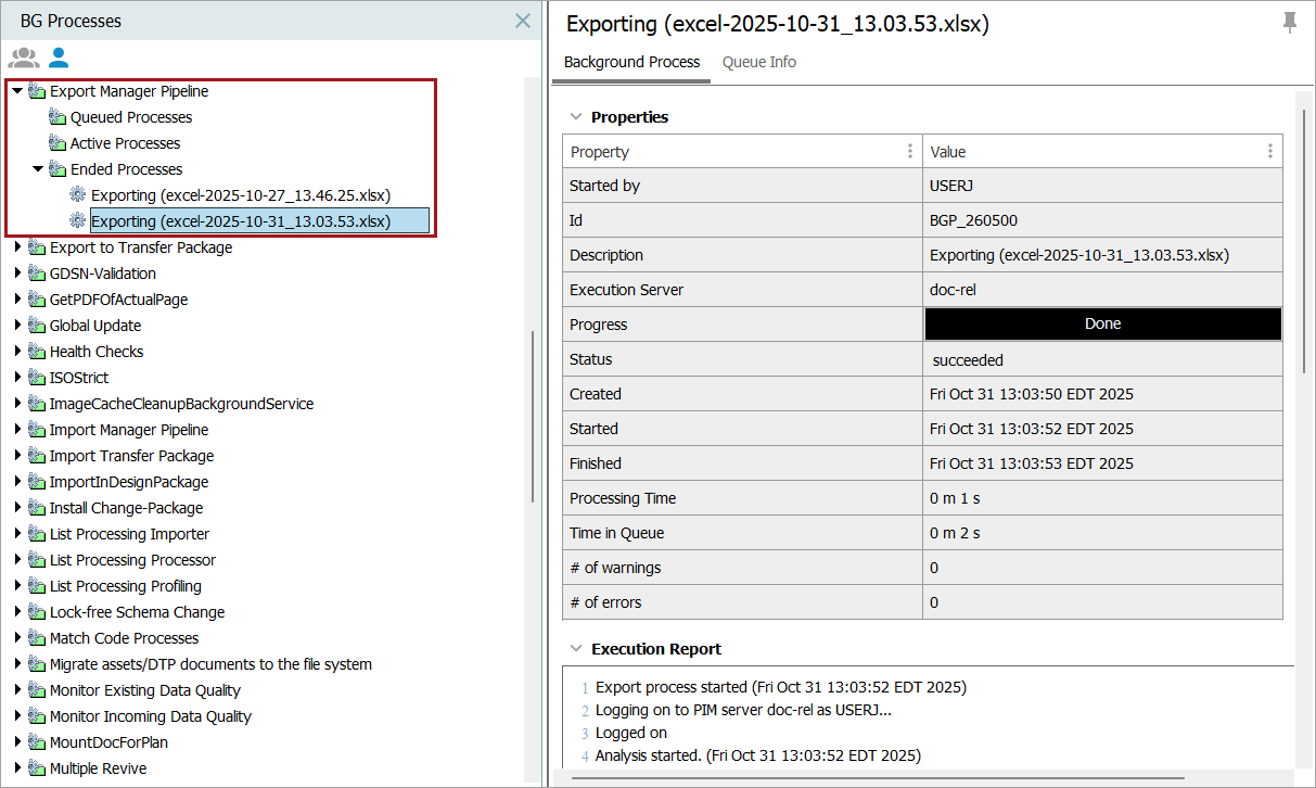 - On the BG Processes tab open the Export Manager Pipeline node. For details on the states of a background process, refer to the BGP States and Quarantine Status topic in the System Setup documentation.