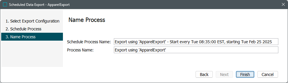 1. For Schedule Process Name, enter a name for the scheduled process. This name is displayed on the process on the BG Processes tab > Scheduled Processes node for all schedule options except 'Now.' The default value includes the name of the export configuration and scheduling details.