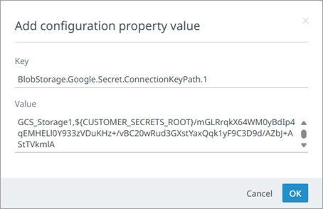 4. Configure the ConnectionKeyPath dropdown parameter using the BlobStorage.Google.Secret.ConnectionKeyPath.[*] property. For example, using this configuration, two options are displayed in the 'ConnectionKeyPath' dropdown for the Gateway Integration Endpoint (explained in the next section):