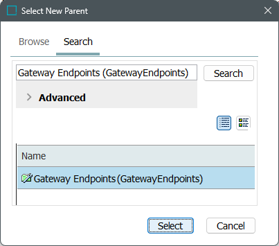 - In the Select New Parent dialog, select the setup group you created, and click Select to make it a valid parent.