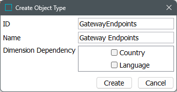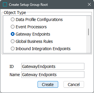 - In the Create Setup Group Root dialog, select the gateway object type, enter an ID and a Name, and click Create.