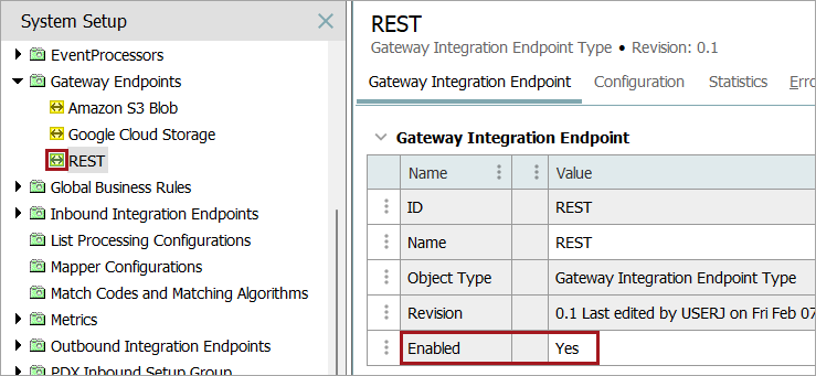), indicating it is active and ready to use. The Gateway Integration Endpoint section 'Enabled' parameter now displays 'Yes.'