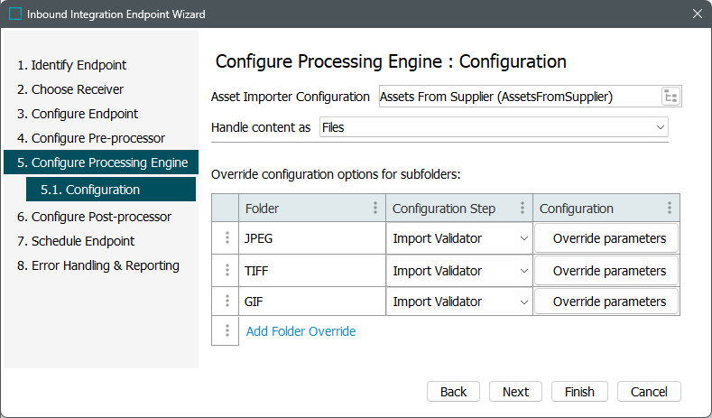 If desired, folder overrides can also be configured, allowing users to replace certain aspects of the asset import configuration for sub folders within the top-level hotfolder. For required configuration, refer to the Asset Importer Configuration topic.
