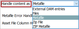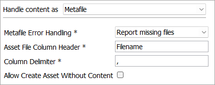 Asset File Column Header - specify the column heading of the metafile that contains the asset information. This includes an asset name; an external URL; or a relative path if the corresponding asset is in a subfolder below the root hotfolder directory. For example, 'Files/1234.jpg' corresponds to the asset name '1234.jpg' found within the 'Files' subfolder.