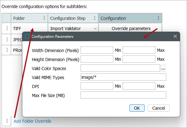 For example, different subfolders may be associated with different MIME Types (such as JPEG, TIFF, etc.). As part of the override configuration pictured above, this use case is addressed by overriding the 'Import Validator' step of the importer configuration and changing the 'MIME Type' parameter to '/jpeg.'