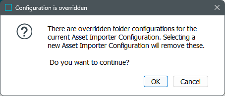 Note: Attempting to change the asset importer configuration after configuring overrides displays a prompt warning that the overrides will be removed.