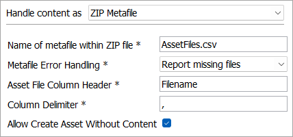 Zip File - use when importing zip files that only contain assets. The file is unpacked during the import process and all asset files are imported according to the remaining configuration options. No additional parameters are required.