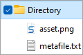 When the zip file is created by selecting a directory (folder) that contains a metafile and one or more asset files to zip, the metafile must express the asset(s) as a path that terminates with the filename. Zipping the 'Directory' in the image below, the metafile.txt must express the asset file as Directory/asset.png.