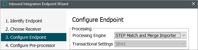 - On the Configure Endpoint step, click the 'Processing Engine' dropdown and select 'STEP Match and Merge Importer.'